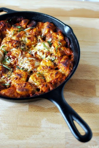 Pour mixture into greased oven safe skillet or 9×13 baking pan. Chiffonade the basil and sprinkle on top along with remaining cheese. Bake according to directions on dough package, checking to make sure dough is cooked through and cheese is bubbling (I always bake mine for an additional 5 minutes). Let cool 5 minutes before serving.