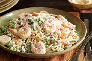 DRAIN spaghetti; return to pan. Add shrimp mixture and bacon; mix lightly. Top with Parmesan.