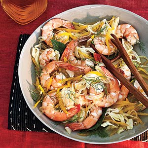 2. Bring 3 quarts water to a boil in a Dutch oven. Add shrimp; cook 3 minutes or just until shrimp turn pink. Drain and rinse with cold water; drain. Place shrimp in a large bowl. Add bell pepper, fennel, shallots, and garlic; toss to combine.