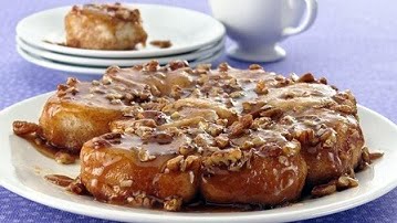 Bake 18 to 22 minutes or until golden brown. Cool 2 minutes; turn upside down onto heatproof serving plate. Let pan remain 1 minute so caramel can drizzle over rolls.