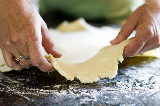 The parchment paper technique is what changed my pie making from hair pulling sessions of frustration to successful pie crafting. I have taught this technique to men, women and children with continued success. It is a great joy for me to see someone who has never made a pie or has had limited success with creating pie achieve their goal of a beautiful pie by using this simple method. Using two pieces of parchment paper (or wax paper in a pinch) the dough can be rolled without sticking and transferred to the pie dish without tearing. Because the ratio of flour and fat has been maintained, the baked crust is tender and delicious!