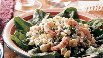 In large saucepan, cook pasta to desired doneness as directed on package, adding peas during last 2 minutes of cooking time. Drain; return to saucepan. Add shrimp, cheese spread, mushrooms and milk; cook over low heat for 1 to 2 minutes or until cheese is melted and mixture is hot, stirring constantly. Serve on a bed of fresh spincach leaves, sprinkled with chopped parsley or basil, if desired.