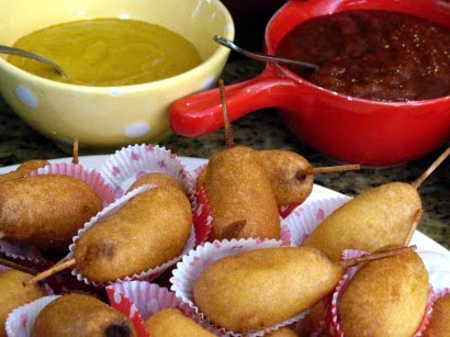 Serve these after hte sticks have cooled for a bit but while corn dogs are hot. Serve with dipping sauces while everyone cheers… for you!