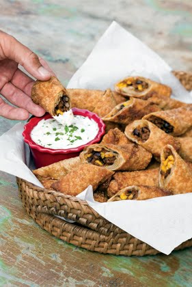 End Zone Souithwest Egg Rolls with Sour Cream Salsa Verde