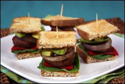 Place 4 bread squares on a plate, buttered sides up. Top each square with 2 spinach leaves, a piece of red pepper, and a grilled mushroom cap. Evenly distribute the grilled onion among the mushroom caps, separating the rings of the onion and arranging each to fit. Evenly top with avocado slices, halving them if needed.