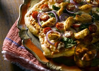 4. Spread pizza dough onto greased pan, about 14" diameter. Mix chicken wing sauce with blue cheese dressing. Spread the sauce mixture onto the pizza dough.