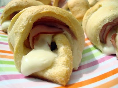 2. Separate crescent rolls into 8 triangles. Cut each slice of cheese in half. Place a slice of ham on each triangle. Place a strip of cheese down the center of the ham. Fold edges of ham in to match the shape of the crescent roll. Roll each crescent roll up ending at the tip of the triangle. Place tip down on a greased cookie sheet.