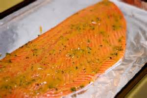 Preheat oven to 375 - line an oven safe baking dish large enough to hold the salmon with tin foil. Place the salmon skin side down on the foil and cook for 10 - 12 minutes depending on the thickness of the fish. Finish the salmon under the broiler for an additional 4 - 5 minutes to caramelize the slather and until the salmon flakes easily.
