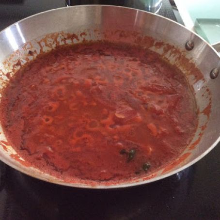 As soon as garlic is sizzling (do not let it brown), add the tomatoes, then the reserved tomato water. Add whole chile or red pepper flakes, oregano (if using) and salt. Stir.