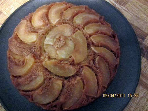 Place your cake plate upside down over the cake in the skillet, then smoothly and quickly turn the cake over. Gently lift up the skillet - the cake should ccome out fairly easily. If you have a couple of apples left on your pan, just remove them and carefully place them where they belong on the cake - no one will know!