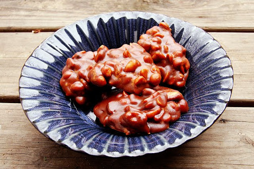 Remove from heat and beat with a wooden spoon for eight minutes, until the mixture thickens. Spoon out on foiled-lined baking sheets and allow to cool for fifteen minutes. Makes about ten pralines.