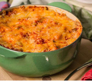 4. Bake the casserole until the cheese is melted and bubbling, about 25 minutes. Slice and serve, topped with scallions and sour cream.