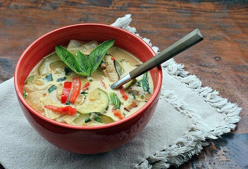 Heat the oil in a large saucepan over medium heat. Add the onions and garlic and cook, stirring, until the onion has softened. Add the crushed red pepper, ginger, and bell pepper and cook for another 2-3 minutes. Add the reconstituted mushrooms, all or their soaking liquid, the coconut milk and the zucchini.
