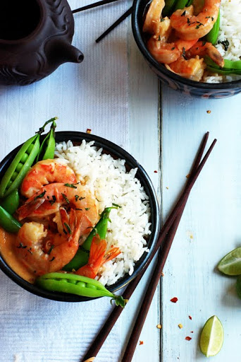 3. Add shrimp and peas, cook until shrimp are opaque and pea pods are tender, approx. 5 minutes.