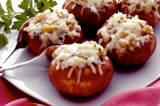Remove stems from the mushrooms; set caps aside. Coarsely chop the stems. In a large skillet, cook chopped mushroom stems & onions in oil over medium-low heat for 5 minutes or until tender. Stir in parsley, basil, & wine. Simmer for 10 minutes or until wine is absorbed. Remove from the heat; cool for 5 minutes. Stir in cheeses. Fill mushroom caps with cheese mixture. Place in a greased 8 x 8 casserole dish. Bake at 350 for 15 minutes or until filling is hot & cheese is melted.