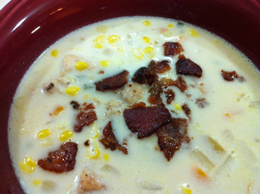 Ladle chowder into bowls. Top with bacon and, if desired, jalapeño pepper slices.