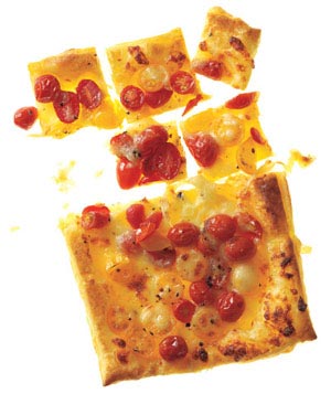 Heat oven to 425. On a lightly floured surface, roll puff pastry into a 9 by 6 inch rectangle. Place on a parchment lined baking sheet & refrigerate until firm, at least 30 minutes. Prick all over w/a fork & top w/tomatoes & cheese. drizzle w/olive oil & sprinkle w/salt & pepper. Bakes until golden brown, about 20-25 minutes.