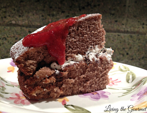 Once the cake has cooled completely turn over to a cake plate and slice horizontally in half. Spoon whipped cream on one half, and place the other cake on top. Sprinkle with confectioner’s sugar and a serve with a teaspoon of fresh jam. Enjoy!
