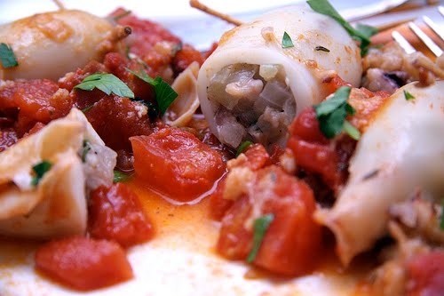 Peel the tomatoes and chop them coarsely. Heat the remaining 2 tablespoons olive oil in a large, Dutch oven. When the oil is hot, add the stuffed squid and sauté, turning until lightly browned on all sides. You may need to do this in batches. I found that browning all the squid at once created too much juice for a proper browning. Once browned lightly, add the tomatoes and thyme.