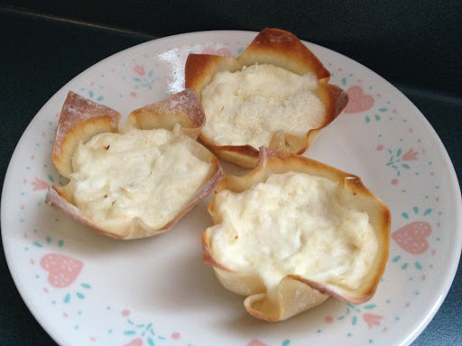 PLACE 1 won ton wrapper in each of 12 muffin pan cups sprayed with cooking spray, extending edges of wrapper over rim of cup. Fill with crab mixture.