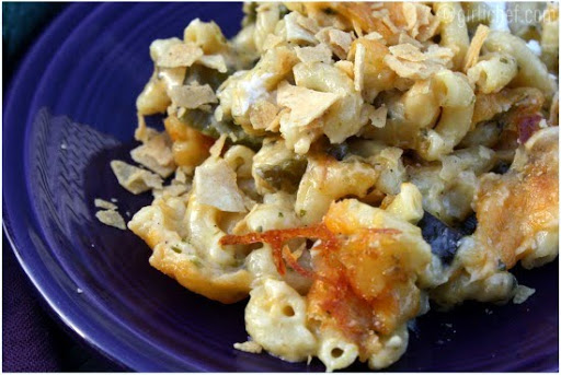 Stir half of the cheese into the sauce until melted. Throw in the pasta and stir until coated. Pour into prepared dish. Top with remaining cheddar cheese and bake, uncovered, until cheese is bubbly and slightly golden. Sprinkle with Cotija (or goat cheese) right when it comes out of the oven (to help it melt in a bit) and crushed tortilla chips (you could also sprinkle these on top before baking, if you wish), if you wish.