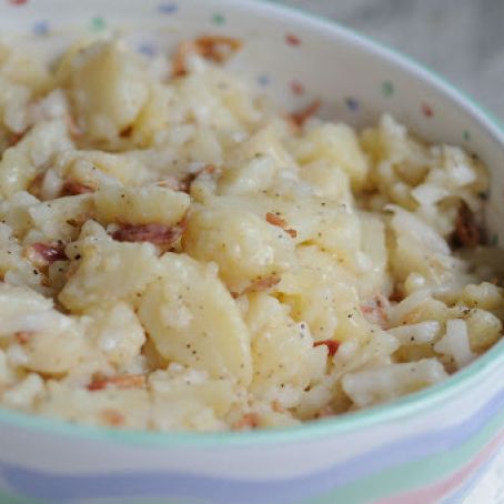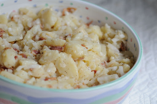 Fry bacon until crisp, add onions and cook until tender. Mix together flour, sugar, salt, celery seed, pepper, vinegar and water until smooth. Add to bacon and onion, simmering stirring until thickened. Add potatoes. Mix gently; heat through.