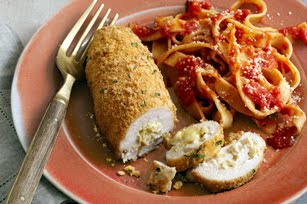 BEAT egg in pie plate. Mix remaining ingredients in separate pie plate. Dip chicken bundles, 1 at a time, in egg, then roll in coating mixture. Place, seam-sides down, in single layer in shallow foil-lined pan sprayed with cooking spray, folding under ends of each chicken bundle to completely enclose filling.