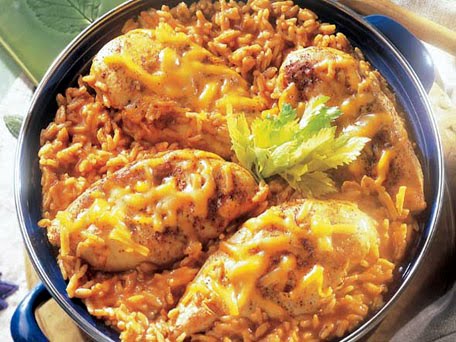 Heat the oil in a 10-inch skillet over medium-high heat. Add the chicken and cook for 10 minutes or until it's well browned on both sides. Remove the chicken from the skillet. Stir the soup, water and chili powder in the skillet and heat to a boil. Stir in the rice. Place the chicken on the rice mixture. Sprinkle the chicken with additional chili powder and the cheese. Reduce the heat to low. Cover and cook for 5 minutes or until the chicken is cooked through and the rice is tender. Stir the rice mixture before serving.