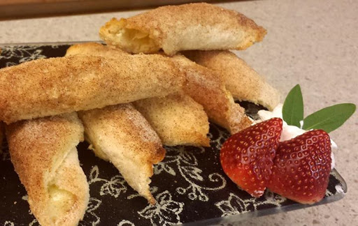 Trim the crusts from the bread and roll the slices flat. Beat together the cream cheese, ½ cup of sugar, egg yolk and vanilla. Spread the bread slices with cream cheese mixture and roll them corner-to-corner. Mix the remaining 1 cup of sugar with the cinnamon and quickly roll the slices through the melted butter (or brush them with a pastry brush) and then through the cinnamon-sugar mixture. Bake in a 375 degree preheated oven until lightly browned. Cool on wire rack. Best served warm. These freeze very well.