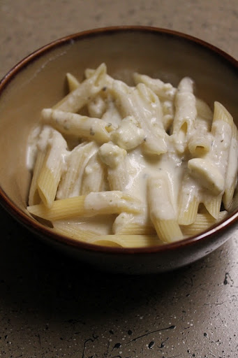 I have been meaning to make this sauce for a while, but I have never gotten around to it until now. I'm sad that it took me this long to make this recipe, because it is so good!! I tweaked the recipe a little bit and added salt and pepper. I also used the garlic and herb Laughing Cow cheese, which made this an incredibly flavorful sauce. It turned out way better than I thought it would. Jon enjoyed it too and said that I could make it again!
