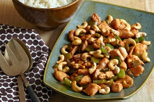 ADD remaining oil and peppers to wok; stir-fry on medium-high heat 2 min. Add chicken; stir-fry 2 min. or until done. Stir in dressing. Spoon onto platter; top with nuts.