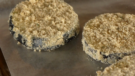 Place the breaded slices of eggplant on the plates into the refrigerator for at least an hour to help set the bread crumbs before frying.
