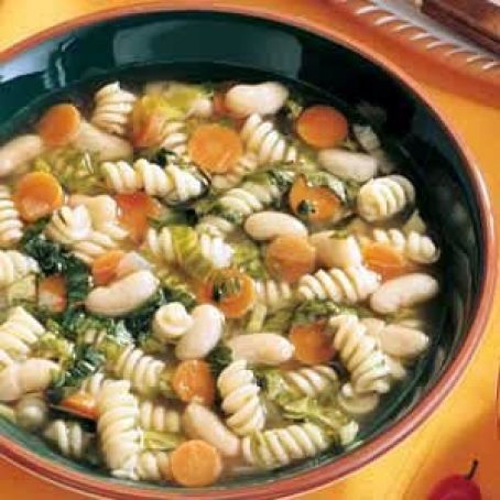 In a large saucepan, saute onion and carrot in oil until onion is tender. Add the broth, water, salt and pepper; bring to a boil. Stir in beans and pasta; return to a boil. Reduce heat; cover and simmer for 15 minutes or until pasta and vegetables are tender, stirring occasionally. Add escarole; cook until just wilted. Yield: 4 servings.