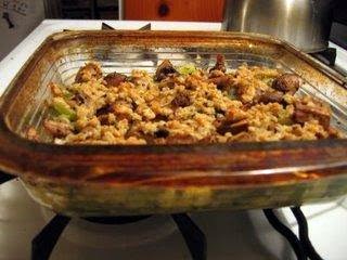 1) Wash the mushrooms under clear water, dry on a towel, and cut the large ones in smaller pieces. Dice up the onion eighth finely. In a large skillet, heat up ½ tablespoon olive oil, and put the onion in to cook for a few minutes over medium heat, until it starts to get translucent. Add the mushrooms, season with dried herbs, and cook for about ten minutes more, until the mushrooms have shrunk and they have released their water. Add the flour and stir to thicken the mixture a little. (NOTE: I forgot the flour entirely, and it came out fine.)