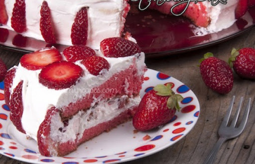 Place first cake layer on serving tray, top with a layer of whipped cream and strawberries, place second cake layer on top and top with remaining whipped cream and strawberries.-+++