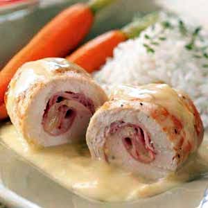 White wine dresses up cream of chicken soup to make a lovely sauce for chicken, ham and Swiss cheese roll-ups. The tried-and-true recipe comes from my mother.