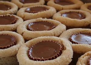 3)Bake at 375 degrees for about 8 minutes. Remove from oven and immediately press a mini peanut butter cup into each ball. Cool and carefully remove from pan.