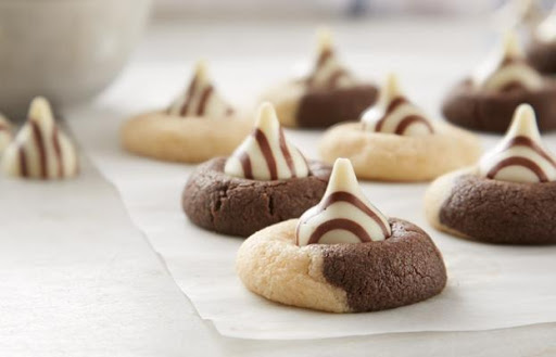 3. Divide dough mixture into halves. Add remaining 2 tablespoons flour to one half and cocoa to the other half, blending well. Roll dough into 1-inch balls. (Roll together a pinch of vanilla dough and a pinch of chocolate dough for marbled cookies.) Place balls on ungreased cookie sheets.