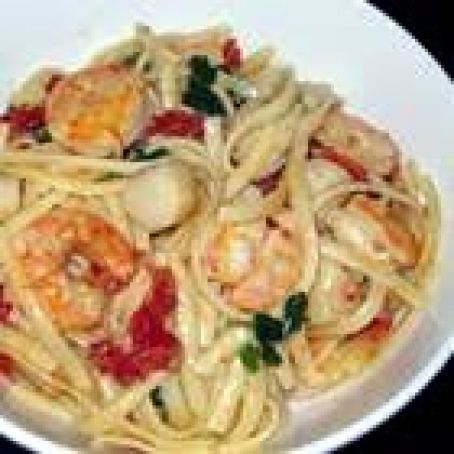 "Tender whole scallops and shrimp get a quick saute in hot, garlicky olive oil and butter before taking a brief clam juice simmer. Toss with hot pasta, bright strips of sun dried tomatoes and tangy bits of lemon zest for a refreshing entree or appetizer."