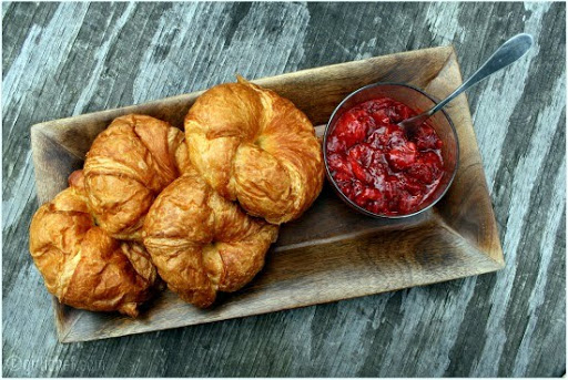 Pastry: Combine flour and salt in a medium-large bowl. Put the butter pieces in a small bowl. Freeze both of the bowls for an hour, then make a well in the center of the flour and add the butter. Cut the butter into the flour with a pastry cutter until the whole thing has the texture of coarse meal (I actually left some pea-sized chunks of butter in there – it’s awesome). Hollow out another concavity in the center of the butter-flour mixture. In a different bowl, whisk the sour cream, lemon juice, and ice water together until evenly blended. Pour half of the liquid volume into the flour and combine them with your fingertips until the dry mix has absorbed all of the liquid in big clumps of dough. Set the clumps aside in another bowl, add the remaining liquid and repeat. You don’t want to overwork the dough because it’s supposed to be flaky pastry, not stretchy bread. Consolidate the lumps of dough together into one mass and wrap in plastic. Refrigerate for an hour. [Deb says you can store the dough for up to one month in the freezer at this point.] Cut the ball of dough in half. Lightly flour a work surface and roll half of the dough out to 1/8-inch thickness (I did a little book folding: fold in thirds, turn again and fold in thirds, roll). Cut shapes to your desired size and geometry. I tried squares (that’s a generous description – they were cut free-hand) and rounds (I used a 3 1/2-inch biscuit cutter). I like both. Move the dough shapes to parchment-lined baking pans and chill in the refrigerator for 30 minutes. Do this over again until you’re out of dough. I made 12 square shapes and 12 circles.