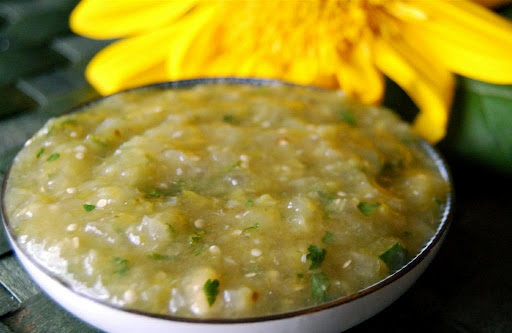 Once the items are cool enough to handle, peel the garlic, remove the skin (and seeds and veins, if necessary) from the jalapeño, and remove the skin from the tomatillos. Now, the insides of a tomatillo is a gelatinous blob of mostly seeds and some pulp. The core of the tomatillos will give you some trouble so you can either core them before broiling or just take a paring knife and cut around it as you remove the skin. I now combine all the roasted ingredients, plus the cilantro and some salt, in a food processor and pulse a few times. I like my salsa verde not smooth but not chunky. Taste and re-salt, if needed. This last time I added a sprinkling of sugar to take the edge off of the tangy tomatillos. Eat immediately. It will keep a few days in the refrigerator but why wait? Put it on eggs, on tortilla chips, over rice, on top of grilled or baked fish, dip into it with grilled shrimp, add a couple of spoonfuls to chile, etc. You get the idea.
