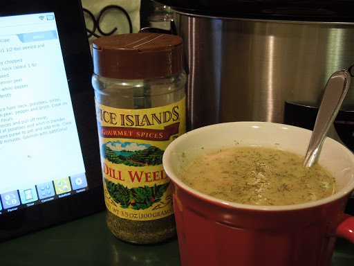 In Crock Pot: place potatoes, onion, ham hocks, dill weed, lemon peel, pepper and broth. Cook on low setting for 6-8 hours.