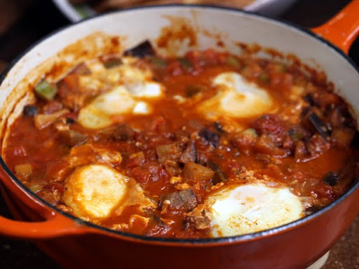 To serve, bring the ratatouille back to a simmer over medium heat, covered, then uncover and stir in the balsamic vinegar. Make 4 nests or wells in the ratatouille and crack an egg into each nest. Cover the pot and cook the eggs to desired doneness, about 2 to 5 minutes. Scoop the ratatouille and eggs into shallow bowls and top with croutons and torn basil.