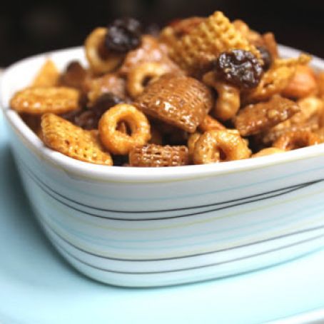 Preheat oven to 250o. Mix cereals, peanuts, raisins, and nuts in a large oven-safe bowl or roasting pan. Melt peanut butter, butter, sugar, and corn syrup in a small saucepan over medium heat (or in a microwave-safe dish). Stir constantly and heat until bubbly around edges. Pour over cereal mix and stir. Bake for 15 minutes. Makes 7 quarts.