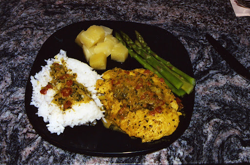 This recipe's title pretty much says it all! Hot Green Curry Chicken over Rice with White Asparagus, Pineapple & Blueberries. It's not as complicated as it sounds and is ready in only 45 minutes. Enjoy!