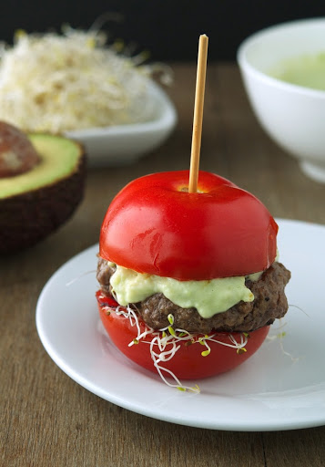 To assemble burgers, place a large pinch of sprouts on the bottom part of each tomato, top with a beef patty, about 2 tablespoons of avocado sauce and finish with the other half of each tomato.
