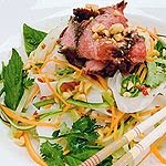 Add cucumber, carrot, onion, coriander, mint and basil to noodle mixture; toss to coat. Divide among bowls or plates; top with steak and sprinkle with peanuts.
