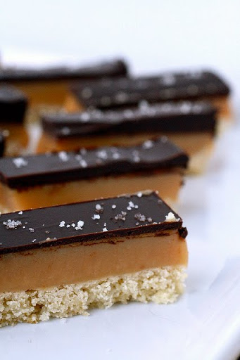 To make the chocolate glaze, combine the chocolate, corn syrup, and butter in a heatproof bowl set over a pan of simmering water. Heat, stirring occasionally, until the chocolate is completely melted and the mixture is smooth. Pour evenly over the caramel layer and use an offset spatula to smooth the top. Allow to cool for a minute or two and then sprinkle with fleur de sel. Chill, covered, until ready to slice and serve.
