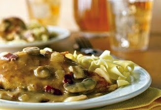 Heat the oil in a 12-inch skillet over medium-high heat. Add the chicken and cook for 10 minutes or until well browned on both sides. Remove the chicken from the skillet. Stir the bacon, garlic powder, black pepper and onion in the skillet. Cook until the bacon is cooked through but not crisp. Add the broth and flour to the skillet and cook and stir until the mixture boils and thickens. Stir in the mushrooms, water chestnuts and wine. Return the chicken to the skillet. Reduce the heat to low. Cook for 5 minutes or until the chicken is cooked through. Serve the chicken and sauce over the noodles.