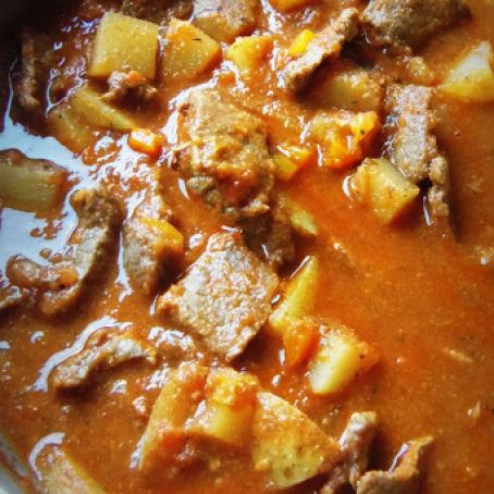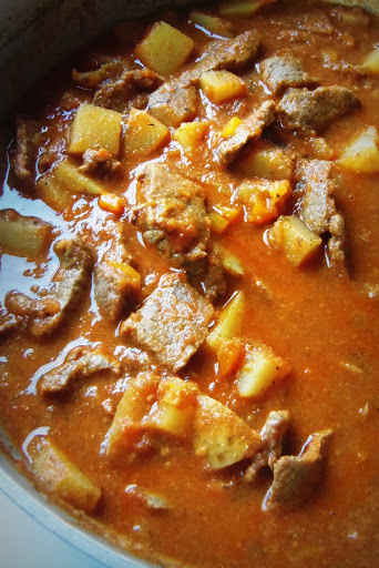 3. To the beef, add the remaining diced onion, bell peppers and potatoes and cook for a few minutes. Add in the sauce from blender, vinegar and tomato paste (or sauce). Bring to a boil, reduce heat and continue cooking for a good 90 minutes or until sauce reduces and meat is tender. I usually like to add more of the dry spices as the beef cooks down. Add to your liking.